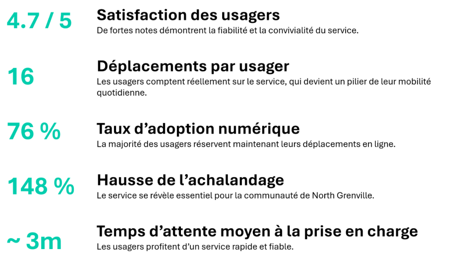 Depuis le lancement du service, North Grenville et NGTransit affichent de solides résultats sur les principaux indicateurs liés à l’expérience des usagers et à l’efficacité opérationnelle. De l’amélioration des taux de satisfaction à l’augmentation mesurable de l’achalandage, les données démontrent clairement le succès et l’impact positif du nouveau système.