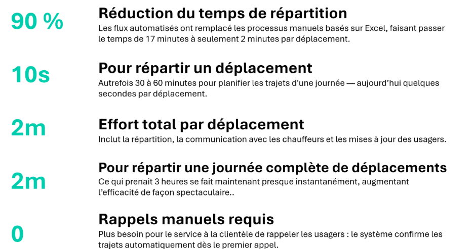La gestion des réservations, des évaluations d’admissibilité, de la planification des itinéraires et de la coordination des chauffeurs reposait sur des fichiers excels, des formulaires papier et des appels téléphoniques. Le personnel était surchargé et les risques d’erreurs élevés.